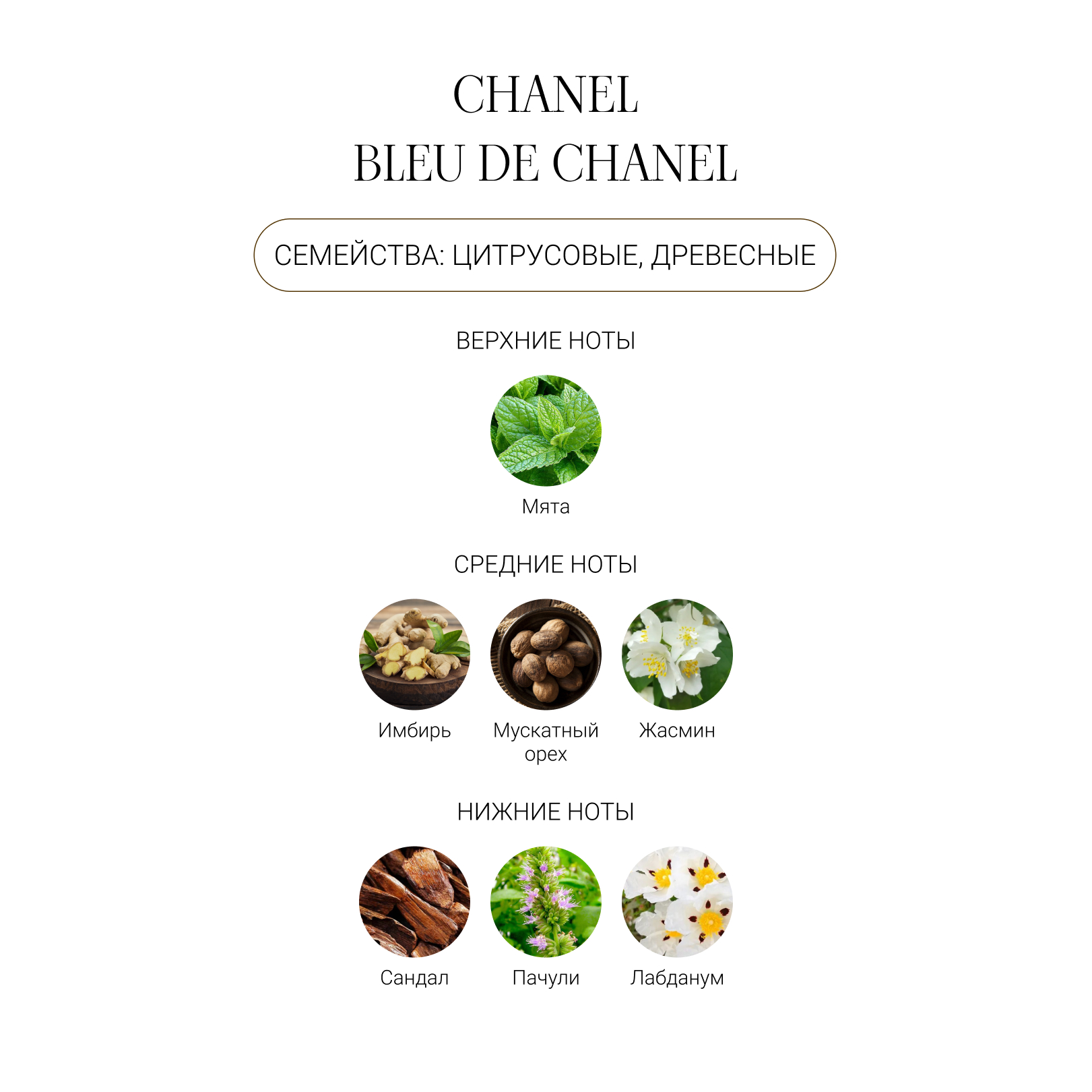 жасмин, имбирь, мята, пачули, сандал